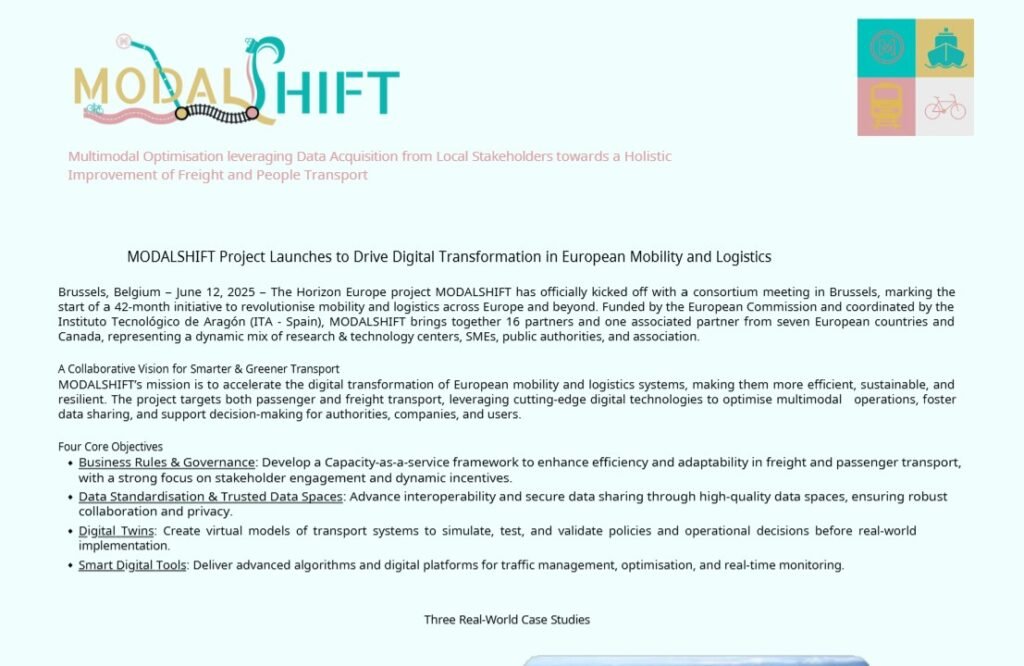 Gathering 17 partners including 1 associated partner across Europe and Canada, MODALSHIFT is a 42-month Horizon Europe project that aims to optimise multimodal and traffic management for an efficient transport network and seamless door-to-door mobility of passengers and freight.